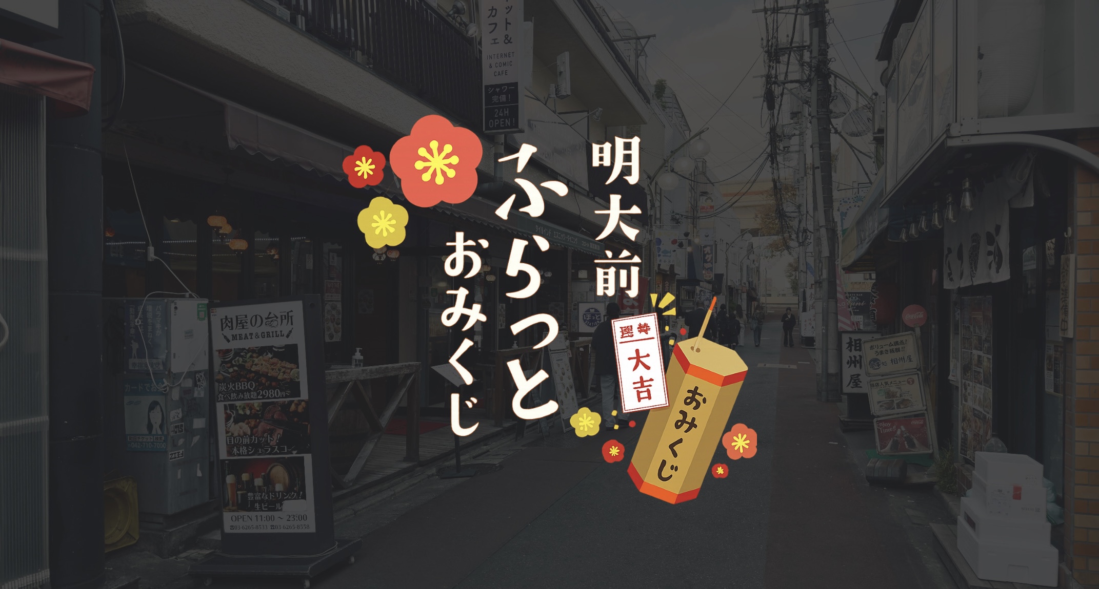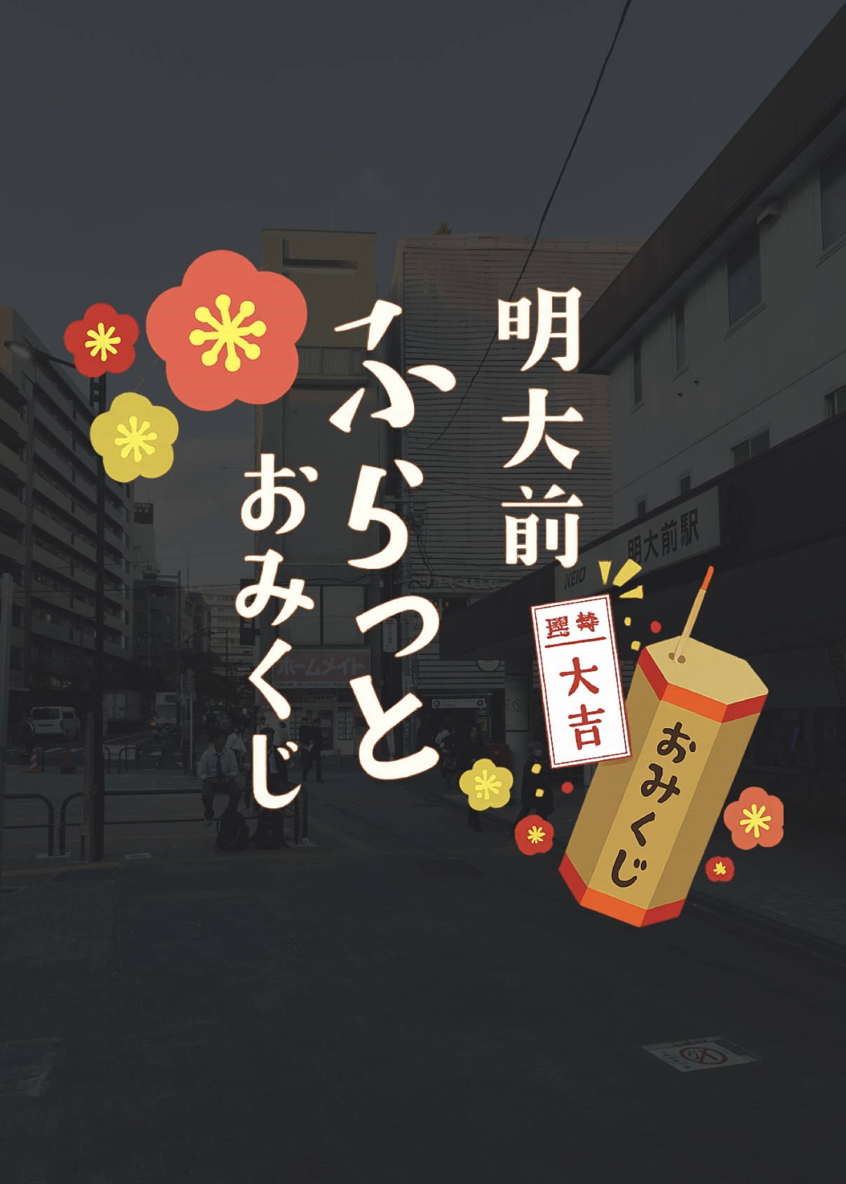 明治大学 情報コミュニケーション学部 清水晶紀基礎ゼミナールが、 明大前商店街振興組合と協力して行う地域活性化企画です。 おみくじを通じて商店街の「隠れた名店」と出会い、 ふらっと立ち寄るきっかけをつくる、 新しい地域連携の取り組みです。